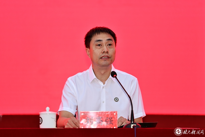 会上,吴义强、仇怡为新生代表佩戴校徽。李蕾代表教师发言,王彬彬、王子杰、姚雨桐分别代表博士、硕士和本科新生发言。